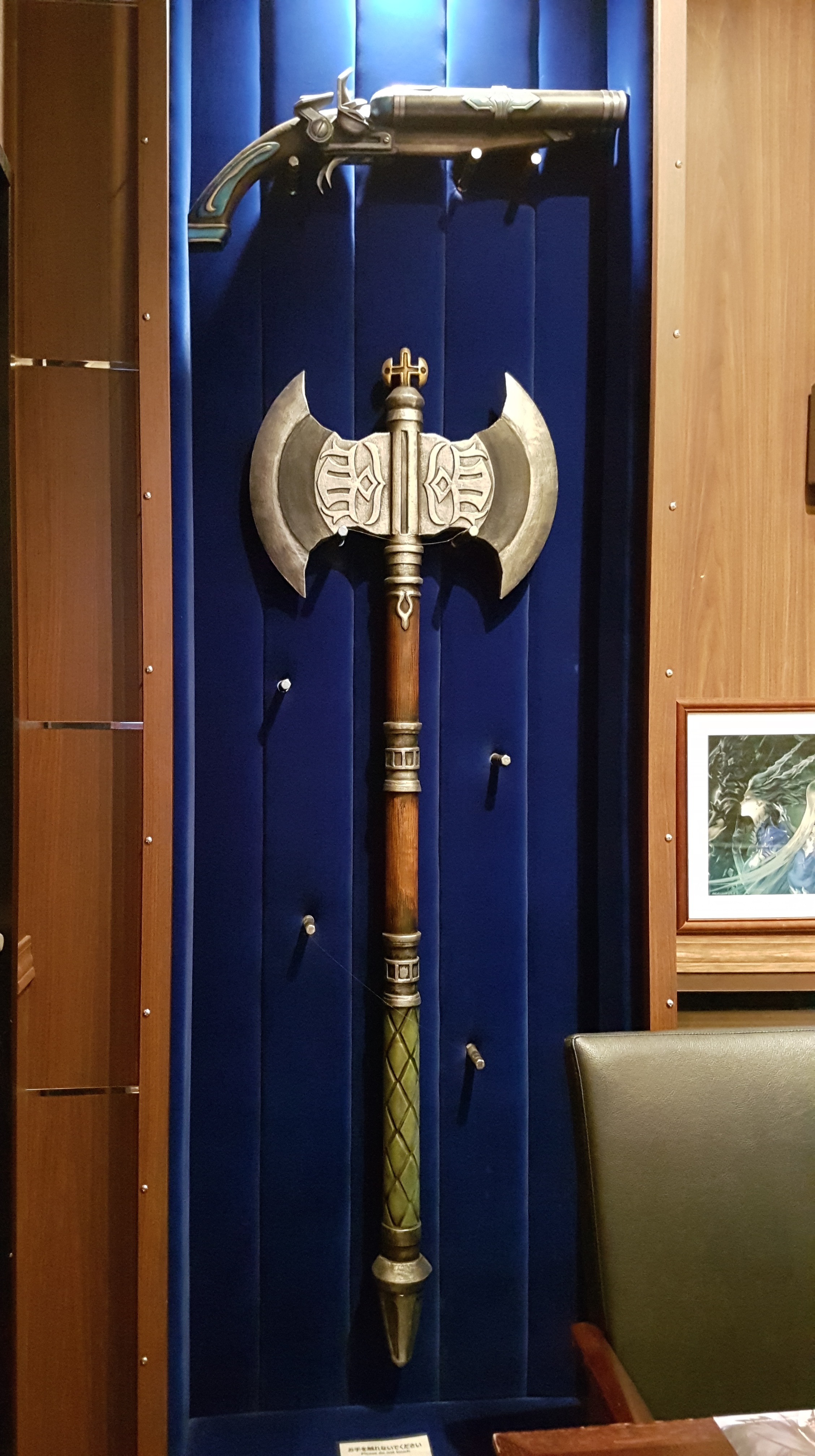 There were also replicas of weapons and armors, signed art portraits and a map of the game world scattered around the room.