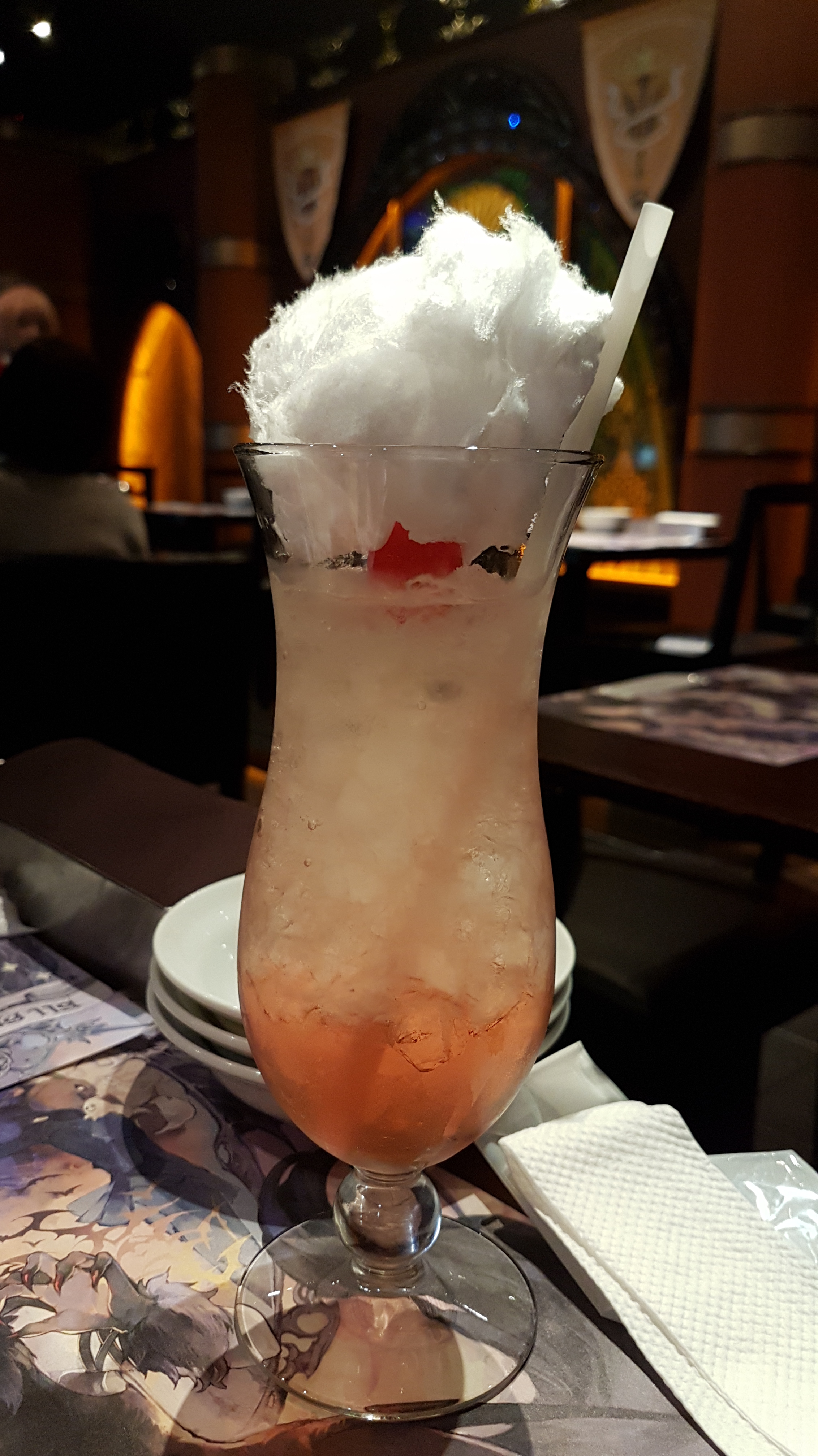 YUM! This was my favorite drink. The white fluff on top is cotton candy and it went really well with the drink. The drink itself had a hint of bitterness to it and so when you had the cotton candy after taking a sip, the cotton candy kind of balanced the flavors out. Anyway, really really good!